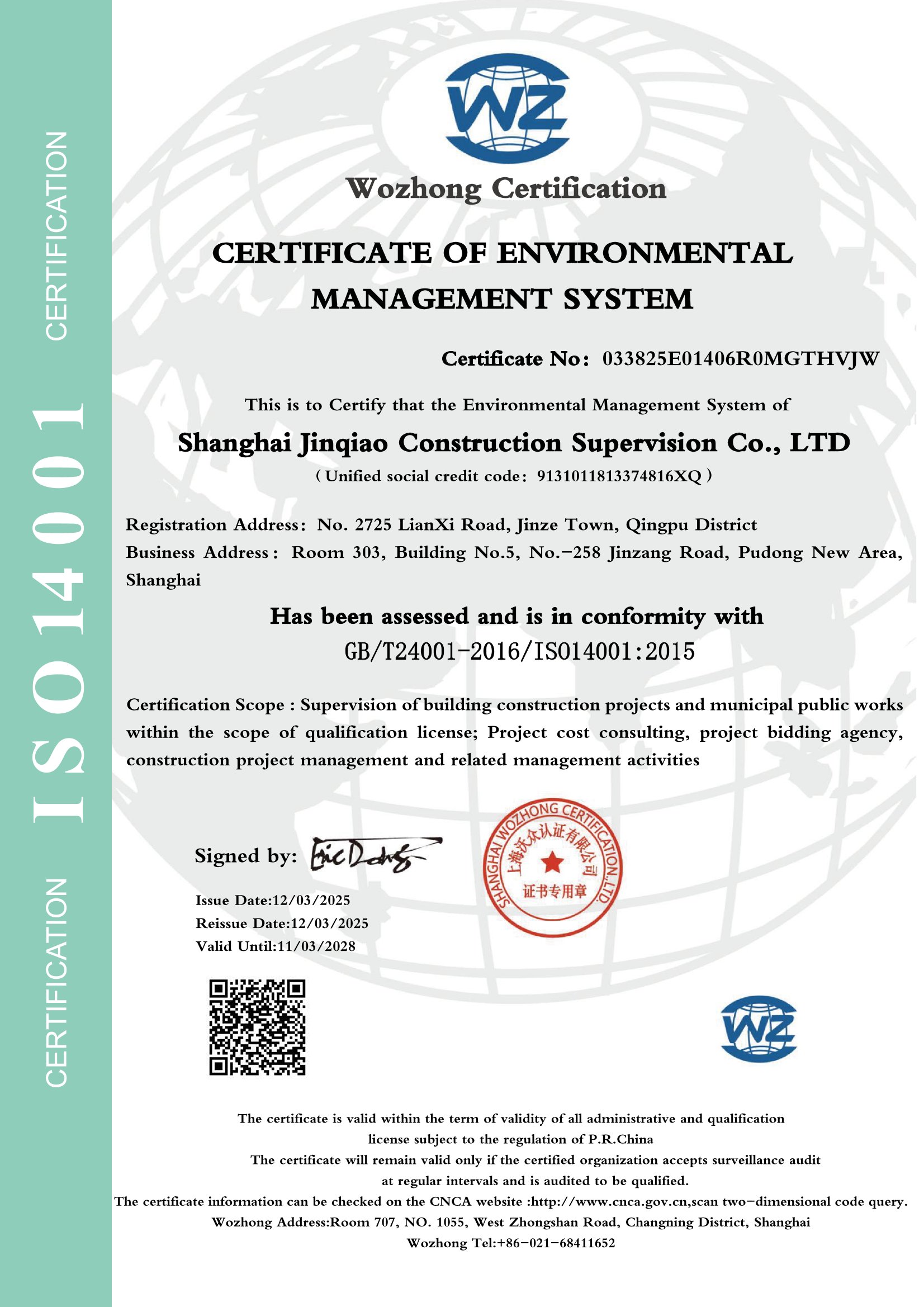 2025年ISO14001环境管理体系认证证书(英文版)