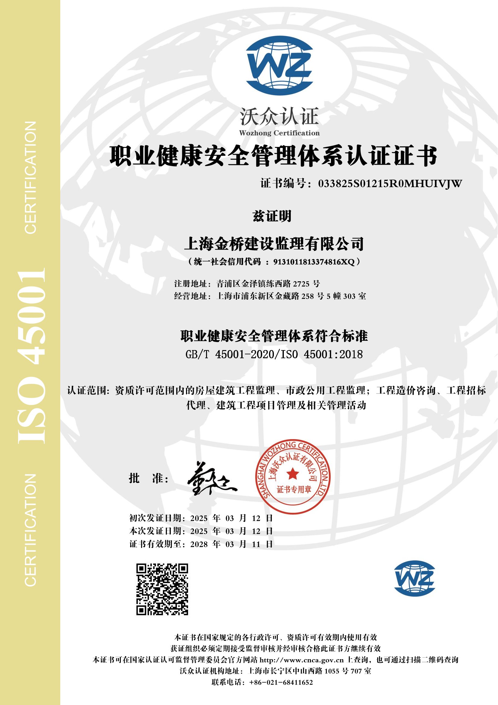 2025年ISO45001职业健康安全管理体系认证证书(英文...