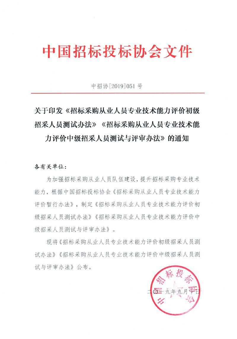 关于印发《招标采购从业人员专业技术能力评价初级招采人员测试办法》《招标采购从业人员专业技术能力评价中级招采人员测试与评审办法》的通知